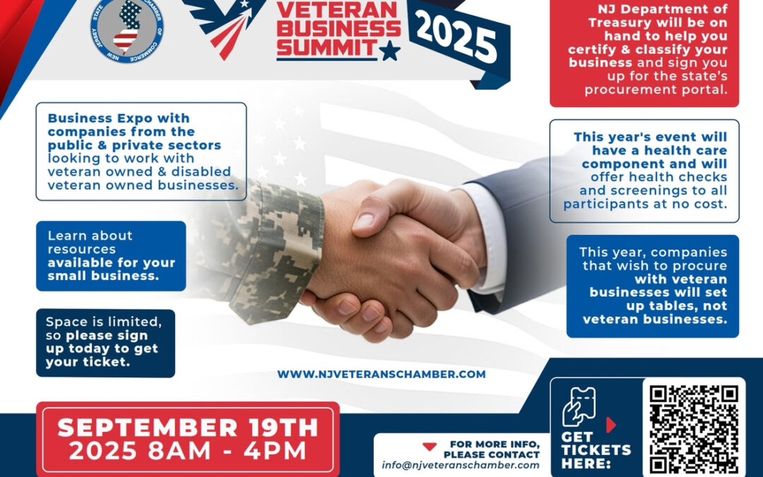 Don’t miss this year’s Veteran Business Summit at Brookdale Community College’s Collins Arena, where veteran-owned businesses will connect directly with public and private sector buyers. The event will feature fireside chats with gubernatorial candidates Jack Ciattarelli and Mikie Sherrill, plus free health screenings for veterans—including early cancer detection. Reserve your spot today!