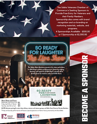 Thank you to our generous sponsor Idaho Veterans Chamber of Commerce, Veterans are eligible for free tickets to So Ready for Laughter: The Live Show. To claim your free ticket please contact Idaho Veterans Chamber of Commerce at admin@idahoveterans.org. Free tickets are limited and based on a first come, first served basis. Would your company like to sponsor Veteran Tickets to attend this once in a lifetime show? Email us at Admin@idahoveterans.org.