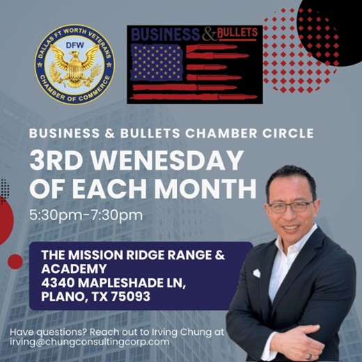 Make every third Wednesday count by joining us at the Business & Bullets Chamber Circle to connect with the DFW veteran community. It’s more than just networking—it’s about building lasting relationships, sharing insights, and supporting each other’s growth.