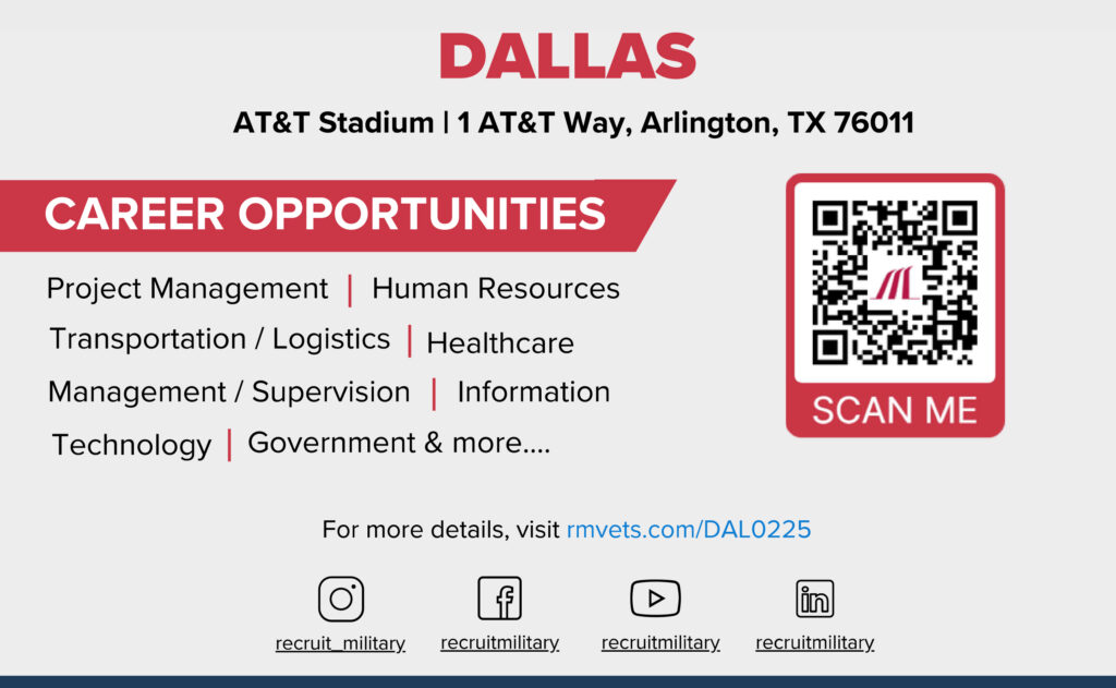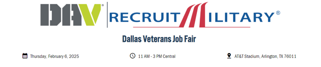 Dallas Veterans Job Fair, February 6, 2025 by admin | MVO Task Force Past Events RecruitMilitary has held 70 events in Dallas, drawing 31,956 attendees and 4,773 exhibitors. Register: myRecruitMilitary