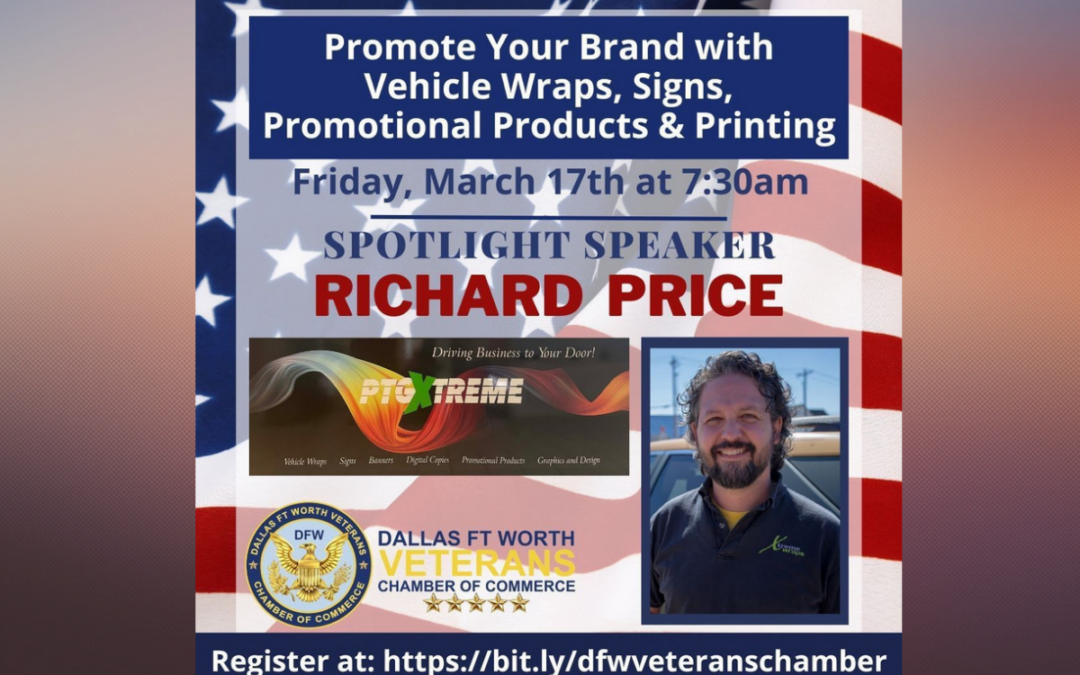 Join the DFW Veterans Chamber Friday morning Friday Morning Reveille featuring guest speaker Richard Price with PTGXtreme Wraps.  Richard will speak on how to “Promote Your Brand with Vehicle Wraps, Signs, Promotional Products & Printing”