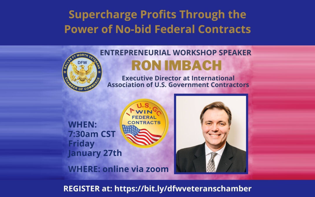 Join us for Friday Morning Reveille at the DFW Veterans Chamber! All are welcome 🙂 This week’s speaker is Ron Imbach, Executive Director at International Association of U.S. Government Contractors