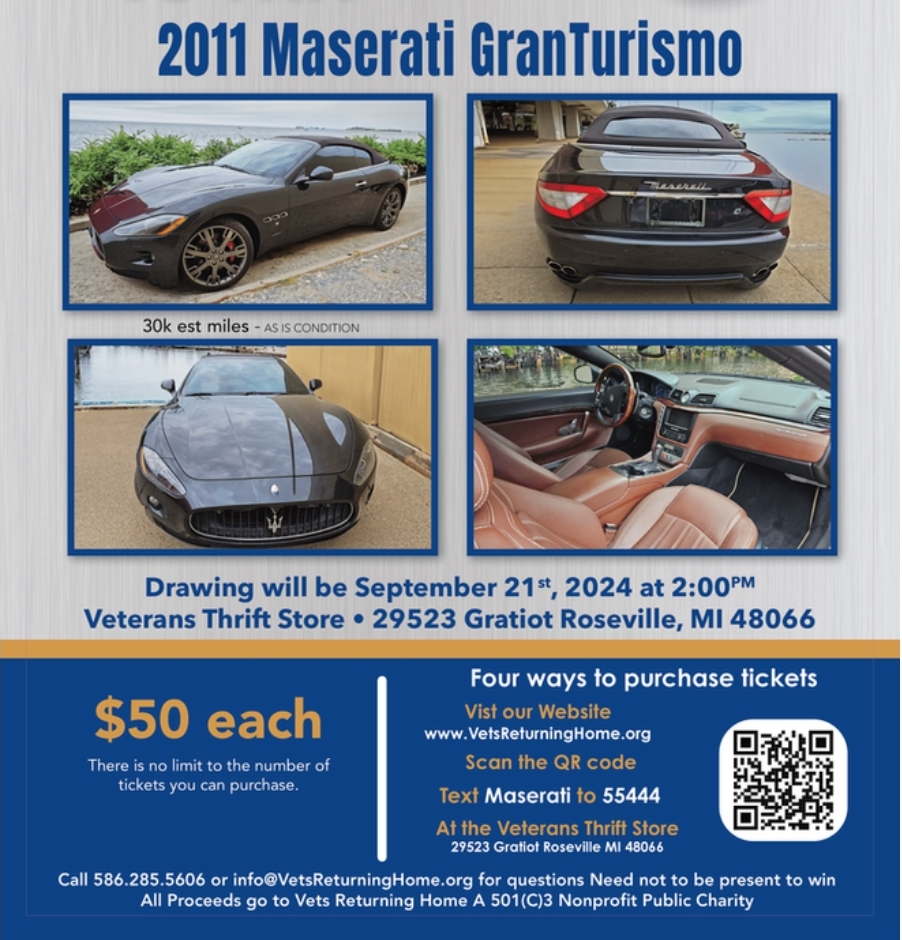 This is an urgent plea for your support to help us keep our shelter sustained for our veterans. We are behind the eight ball on our Maserati raffle ticket sales and there are only 10 days left! Please help us get these tickets sold.. share with your family & friends. We will be having hot dogs and soft drinks on the day of the drawing.