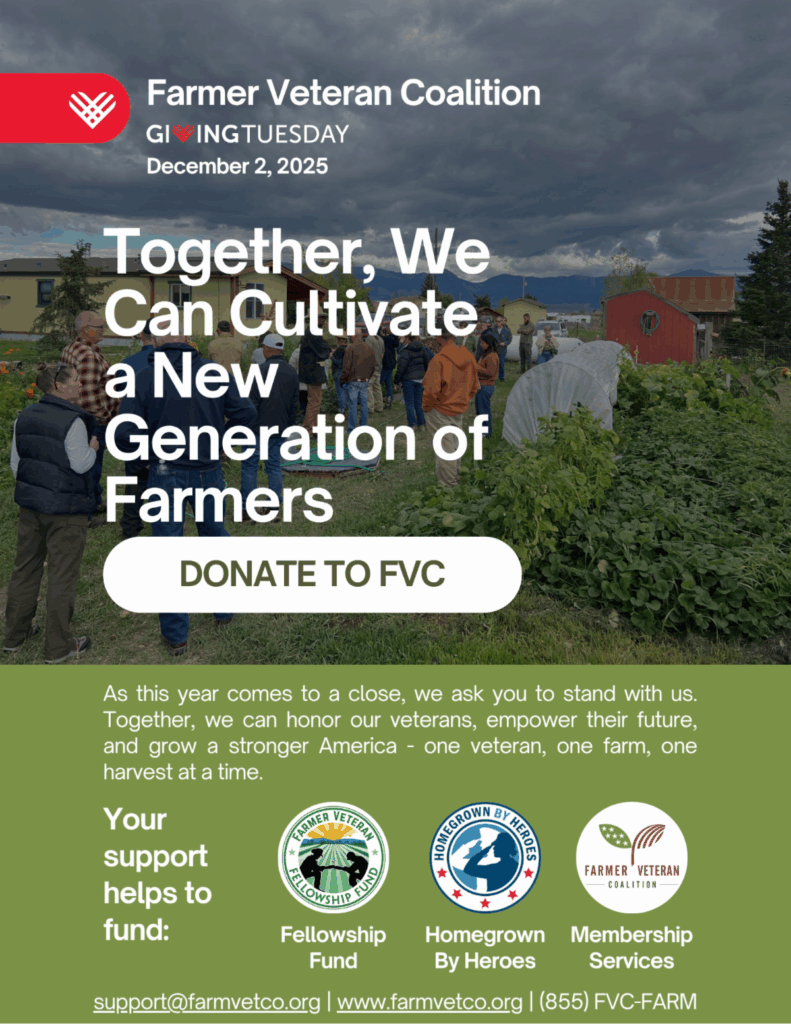 When you choose to support the Farmer Veteran Coalition, you’re not just donating to an organization… you’re lifting up a veteran who’s working hard to build a new life, a new purpose, and a new way to serve.