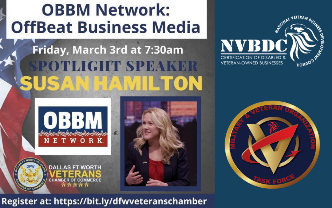 | Contact Info for Susan Hamilton: Listen to the podcasts at:https://www.obbmnetworkpodcasts.com/Connect on LinkedIn:https://www.linkedin.com/in/skhamilton/ Email:Susan@OffBeatBusiness.com Phone:214-714-0495 Want to know more about our chamber? Go to www.dfwveteranschamber.org |