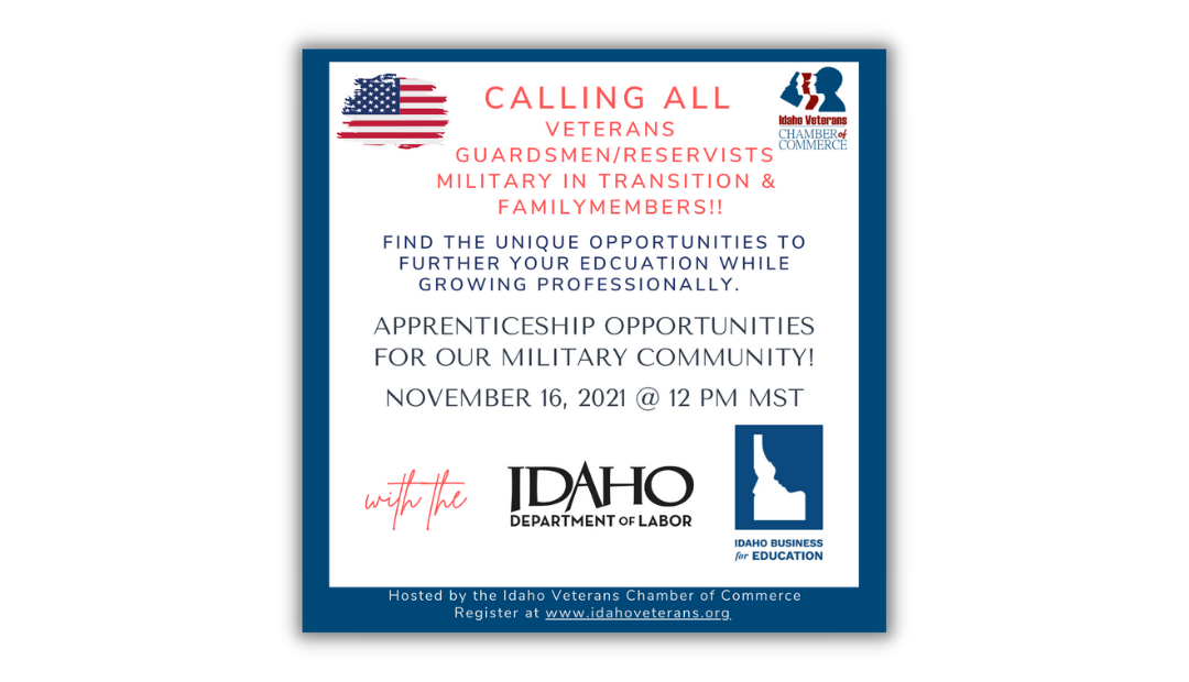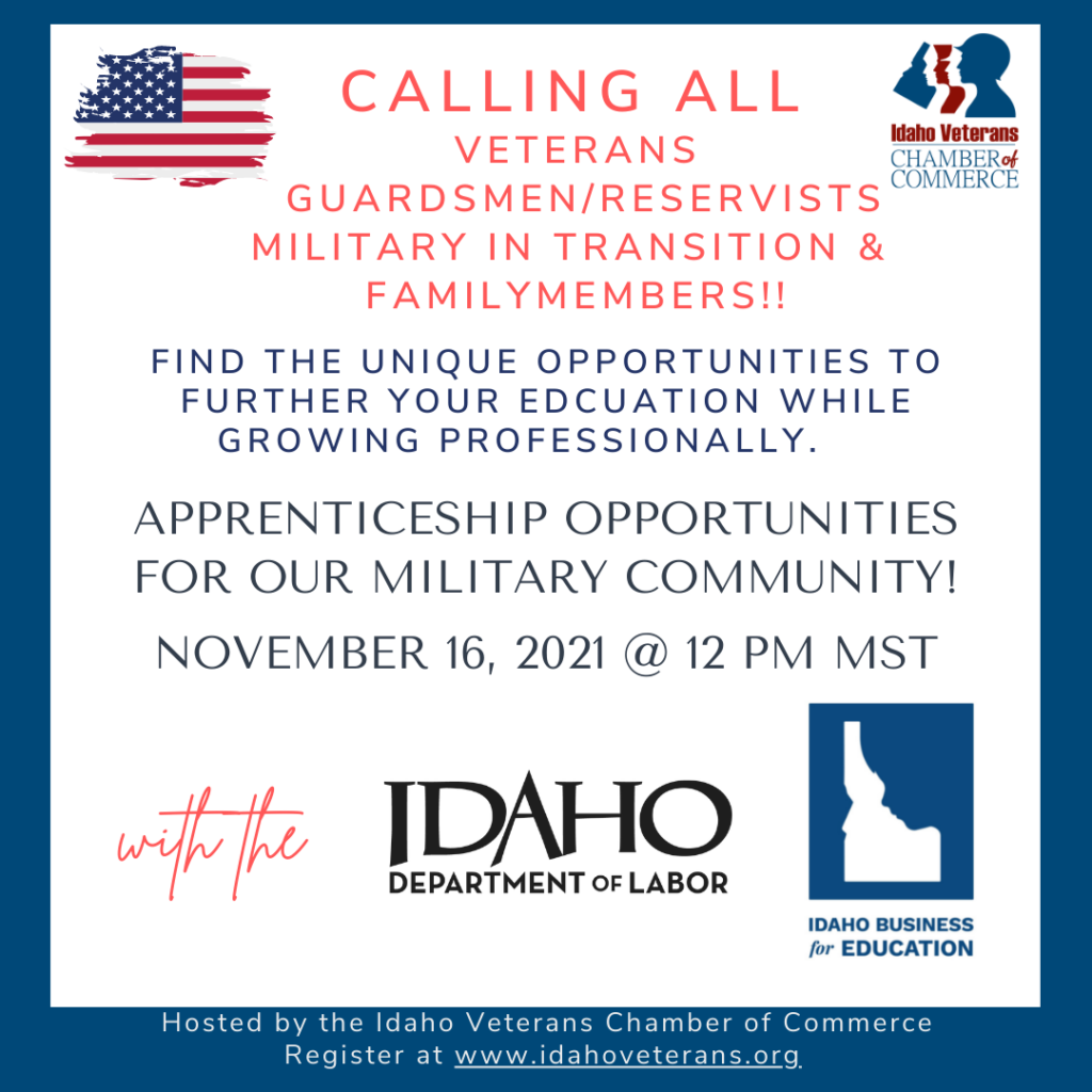 Learn more about the apprenticeship opportunities available all across the state of Idaho that will help you gain the skills, experience, and certifications in all industries. This virtual workshop is presented by the Idaho Department of Labor and the Idaho Business for Education in partnership with the Idaho Veterans Chamber of Commerce. We welcome all military serving to include Guard/Reserve, veterans that have transitioned, and family members (Spouses/dependents) across all services.
