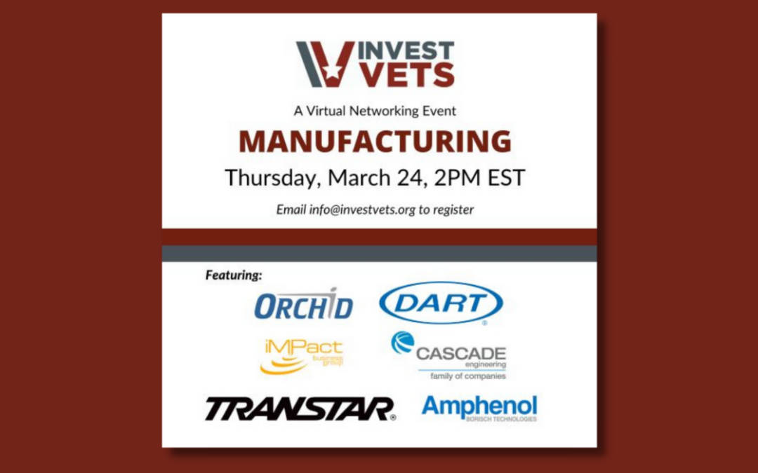 InvestVets Virtual Networking Events are WEEKLY at 1400 HRS – with different featured employment sectors each week! Email info@investvets.org for more information.