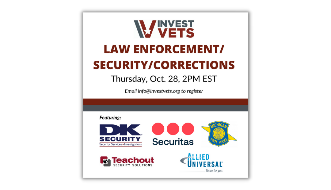 Attention Veterans, Active Service Members, Guard Members, Reservists, family members, and community partners! Join InvestVets Thursday, October 28 at 2:00 pm EST for their Virtual Networking Event featuring employers in the Law Enforcement / Security / Corrections Sector. Check out the participating employers below and we look forward to seeing you.