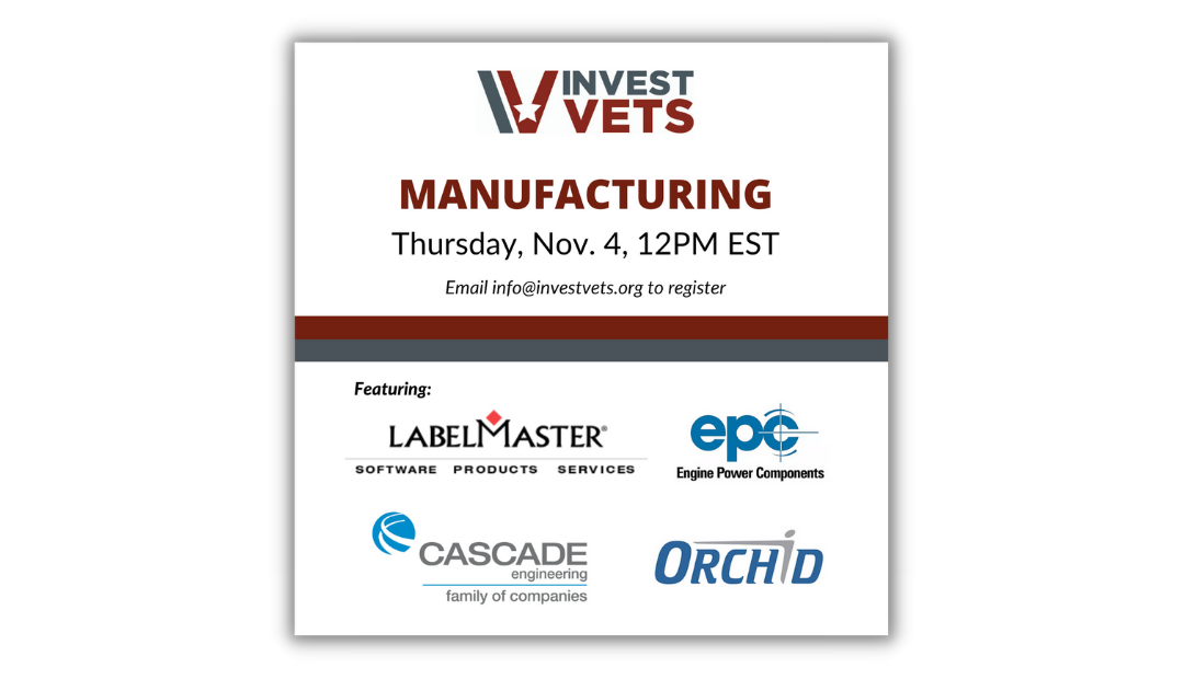 Attention Veterans, Active Service Members, Guard Members, Reservists, family members and community partners! Join us Thursday, November 4 at Noon EST for InvestVets’ Virtual Networking Event featuring employers in the Manufacturing Sector. Check out the participating employers and we look forward to seeing you.