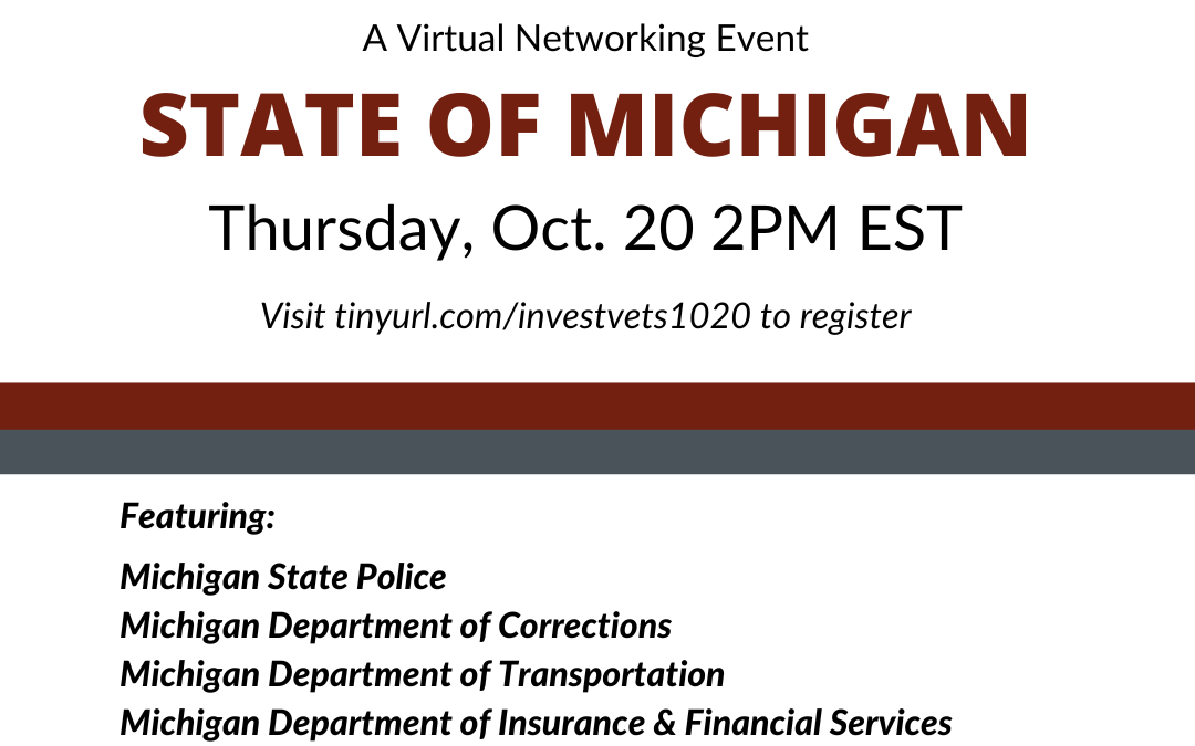 Attention Veterans, Active Service Members, Guard Members, Reservists, Family Members and Community Organizations! Join us Thursday, October 20 at :00pm EST for our 97th Virtual Networking Event featuring opportunities from State of Michigan Government. Check out the participating agencies!