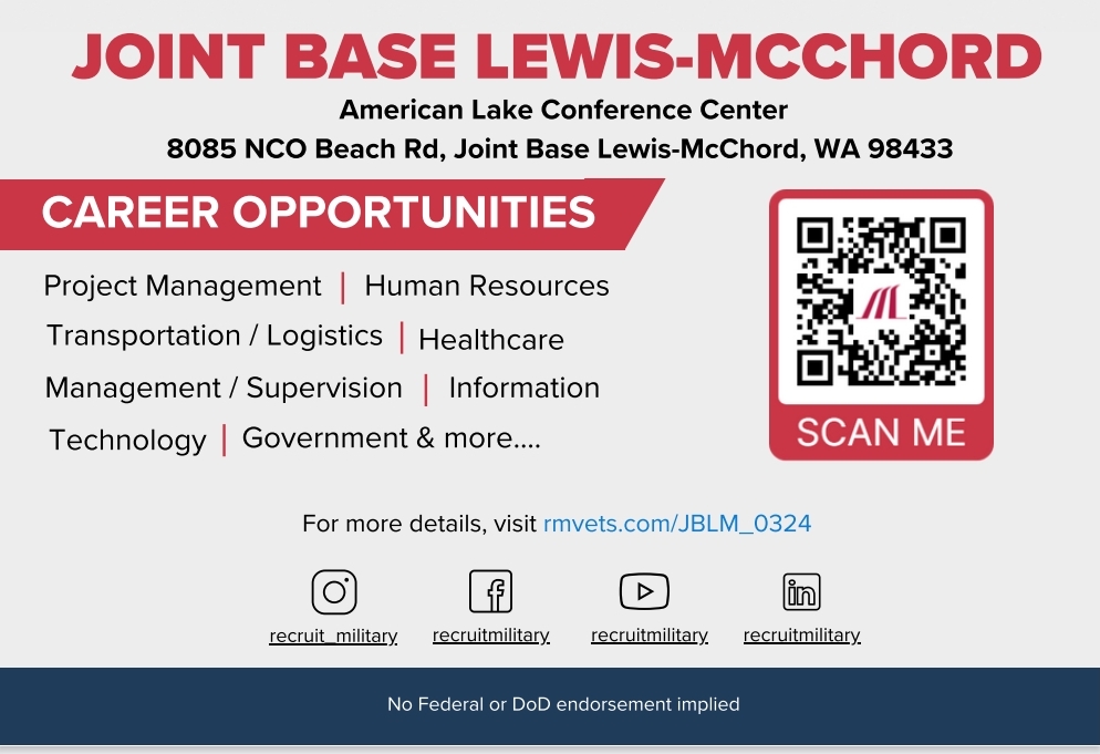 To register:  Job Fair at Joint Base Lewis McChord Exhibitor Information – March 28, 2024 (recruitmilitary.com)