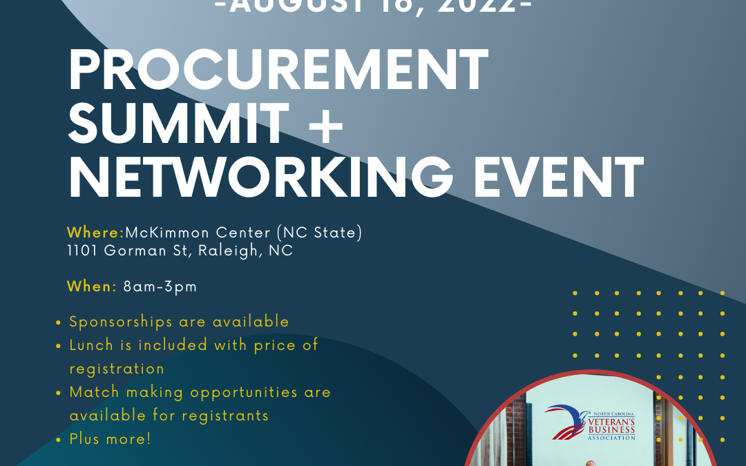 The North Carolina Veterans Business Association is hosting their annual Procurement Summit in Raleigh, NC on August 16th at the McKimmon Center. This Procurement Summit is the perfect opportunity for North Carolina’s veteran-owned, military spouses and small businesses to access resources, education, and connection to corporations and agencies seeking to do business in North Carolina. Our Keynote speaker will be Mr. Allen Thomas, SBA Regional Administrator-Southeast. You do not have to live in or have a business headquartered in NC to attend. This event is open to all.