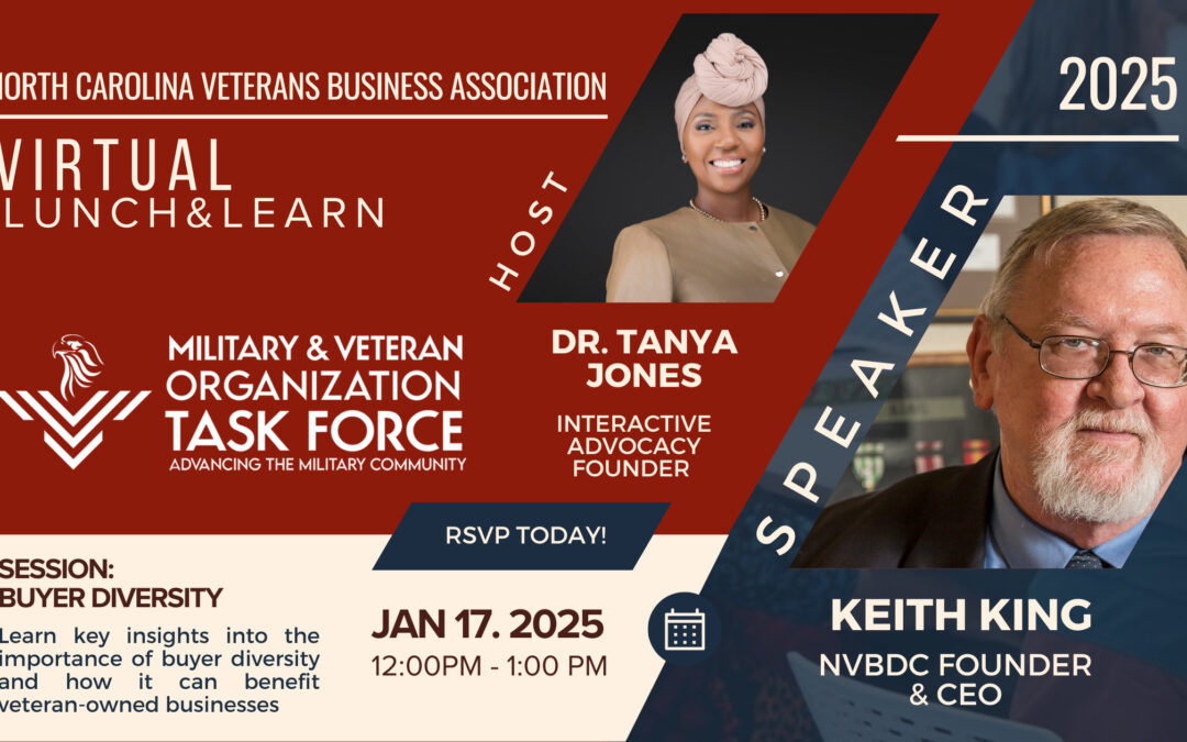 Join NVBDC on the upcoming NC Veteran Business Association as NVBDC’s CEO & Founder Keith King presents on Becoming a Certified Veteran-Owned Business with NVBDC on their monthly Lunch & Learn series from 12:00pm-1:00pm EST