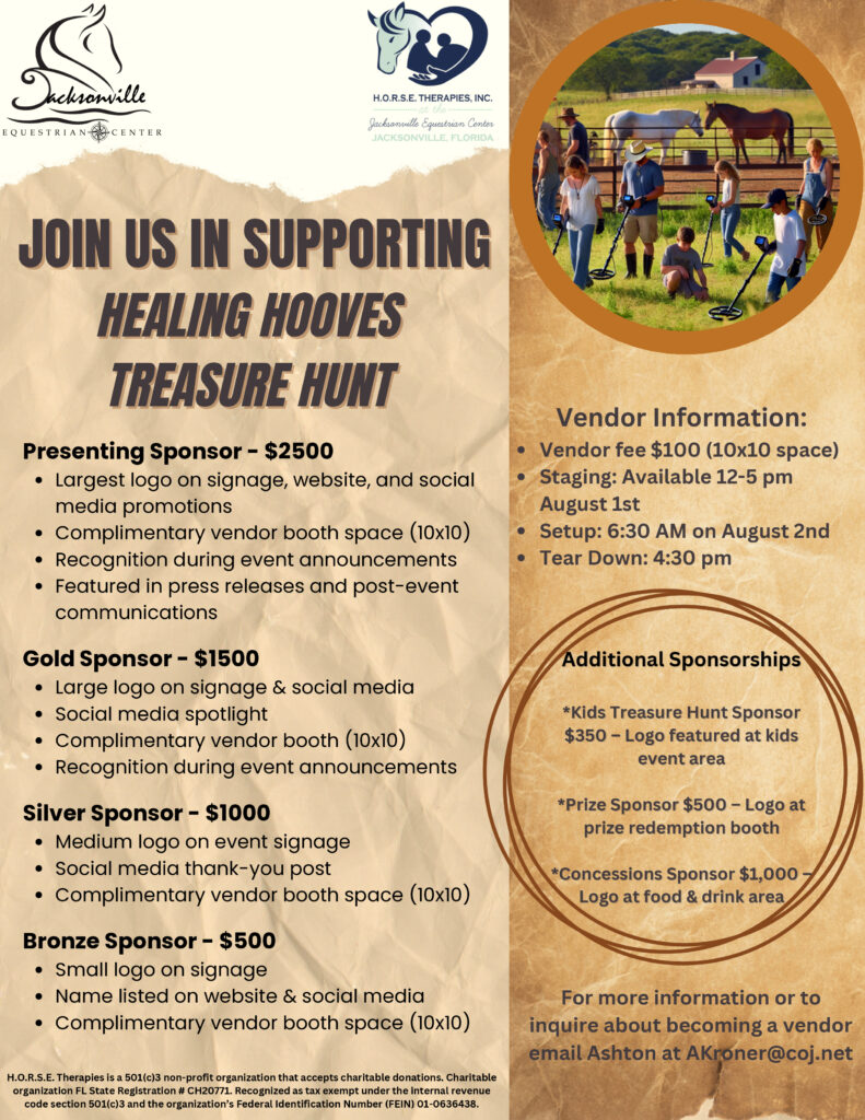 Join us for a day of adventure and discovery at the Healing Hooves Treasure Hunt! Held at the Jacksonville Equestrian Center. Once a U.S. Navy Base-this metal-detecting event lets you unearth hidden treasures on historic grounds. Enjoy a seeded hunt, a separate kids treasure area, and exciting prizes! Proceeds benefit H.O.R.S.E. Therapies, Inc., supporting therapeutic riding programs that change lives.