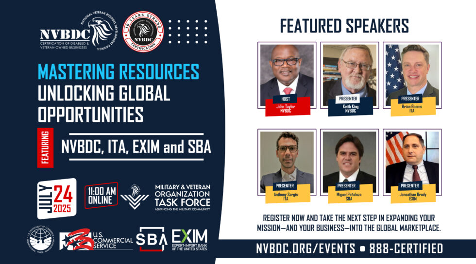 To help address these challenges head-on, the National Veteran Business Development Council (NVBDC) is launching an export-focused webinar designed specifically for its certified Service-Disabled and Veteran-Owned Businesses (SD/VOBs). The webinar will feature a powerhouse lineup of federal agencies that specialize in helping American companies thrive internationally: the U.S. Small Business Administration (SBA), the Export-Import Bank of the United States (EXIM), and the International Trade Administration (ITA).