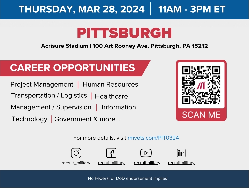 To register: Pittsburgh Veterans Job Fair Exhibitor Information – March 28, 2024 (recruitmilitary.com)