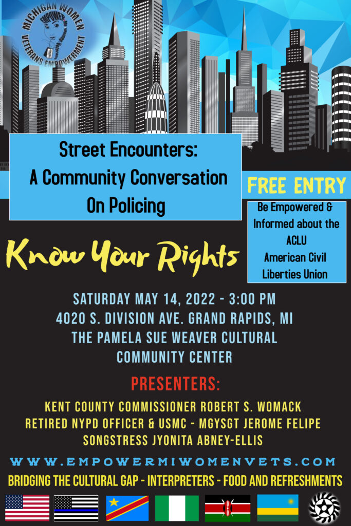 Join MI Women Veterans Empowerment as they strive to bridge the cultural gap. This event hosted at the Pamela Sue Weaver Cultural Community Center located 4020 S. division Ave, Grand Rapids, MI. Among the presenters is Kent County Commissioner Robert S. Womack. The purpose of this empowerment event is to try to bridge the cultural gap and empower the youth on the ACLU
