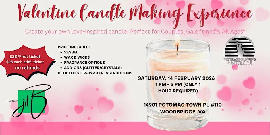 Celebrate Valentine’s Day with a creative, hands-on experience at Veterans Growing America. Join us for a Valentine Candle Making Experience, where you’ll design and pour your own custom candle in a relaxed, welcoming environment.