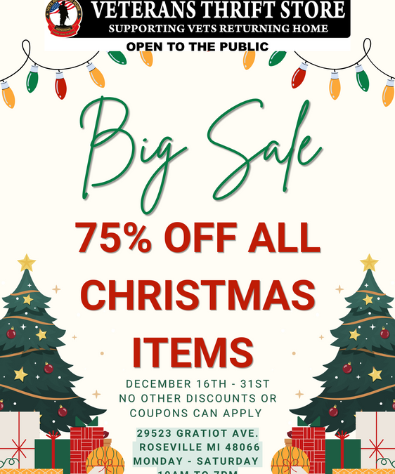 Please come by our store and enjoy this HUGE sale on our Christmas items! Our inventory is brand new to gently used at super discounted prices. Hurry in and don’t miss out on this incredible deal. Each purchase made at the Veterans Thrift Store helps us support our veterans at Vets Returning Home. Thank you. We appreciate your support so much!