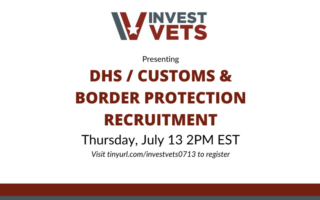 Attention Veterans, Active Service Members, Guard Members, Reservists, Family Members and Community Organizations! Join us Thursday, July 13 at 1400 HRS (2:00pm EST) for our InvestVets Virtual Recruitment Event.