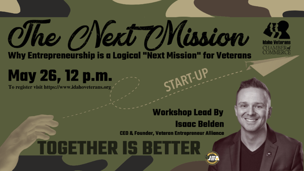 For decades, veterans have been a vital part of the nation’s business sector. Their ability to leverage valuable skills learned during service can set them up to be successful in the entrepreneurial sector. Register now to join “The Next Mission: Why Entrepreneurship is a Logical ‘Next Mission’ for Veterans” workshop led by Isaac Belden, CEO & Founder of the Veteran Entrepreneur Alliance.