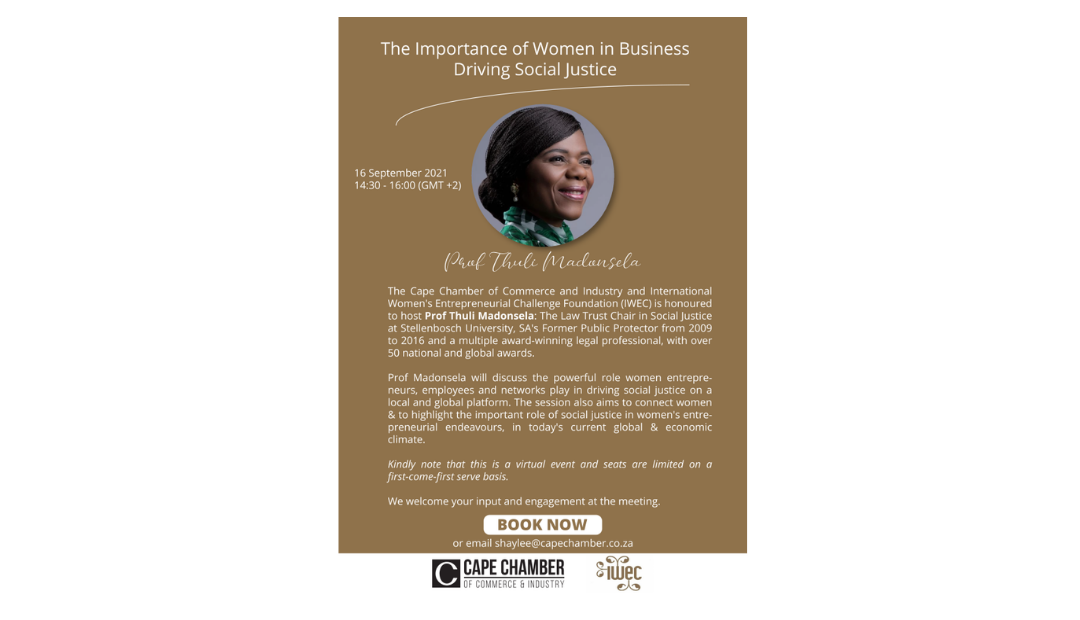 The Cape Chamber of Commerce and Industry (South Africa) and International Women’s Entrepreneurial Challenge Foundation (IWEC) is honoured to host Prof Thuli Madonsela: The Law Trust Chair in Social Justice at Stellenbosch University, SA’s Former Public Protector from 2009 to 2016 and a multiple award-winning legal professional, with over 50 national and global awards.